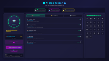 50 News Headlines including: "Your slop is in the top 100% of all slop generated today!" "Dev found bug. Relabeled as 'feature'. Problem solved." "This message...