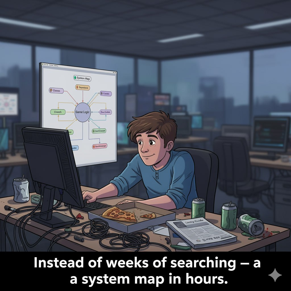This time, we stepped in. He asked: “Where’s the player progress system?” And instead of another Slack thread, the map appeared — classes, events, dependencies, API usages, all linked.