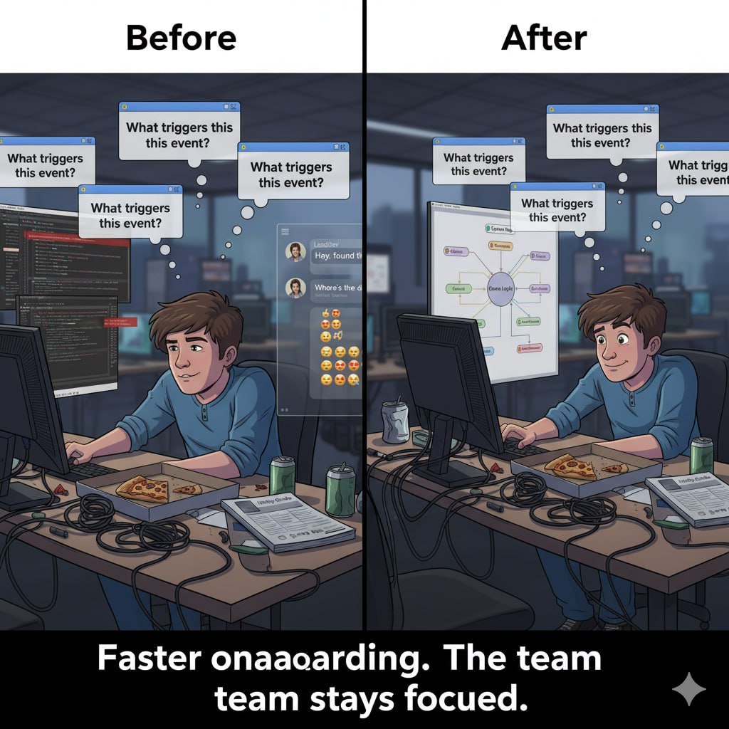 Day one looked familiar: digging through scripts, asking “what triggers this event?”, pulling seniors into Slack threads, slowing the sprint.