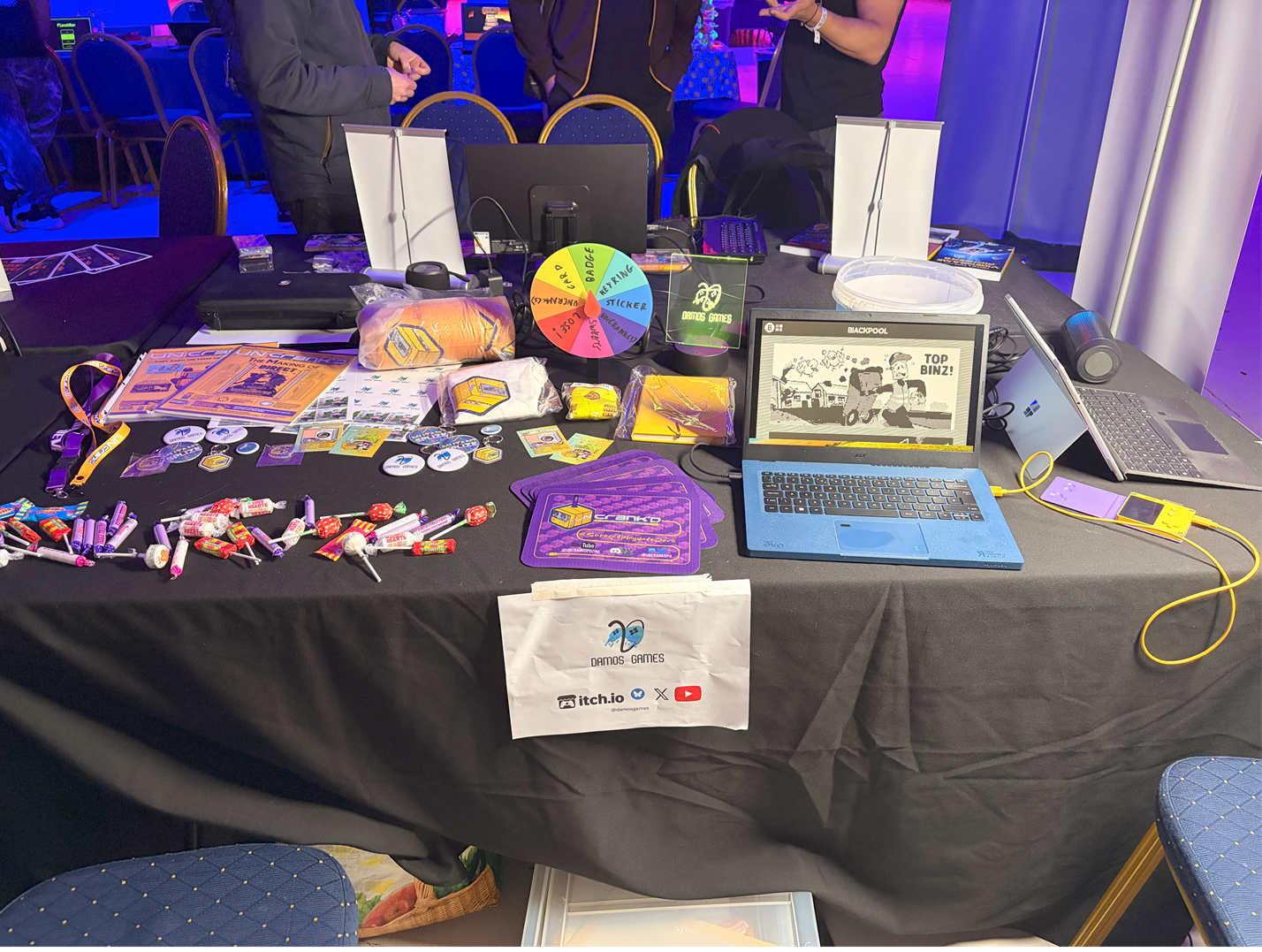 Copying other trade shows I'd been too, I had a prize spinner for the swag which made things more fun and interactive and paced the distribution. I still had loads left on day 2 and was just giving things out then. Tip to anyone doing an event, order merch as early as possible and have backup plans for if stuff doesn't show up or goes wrong or is poorly received.
