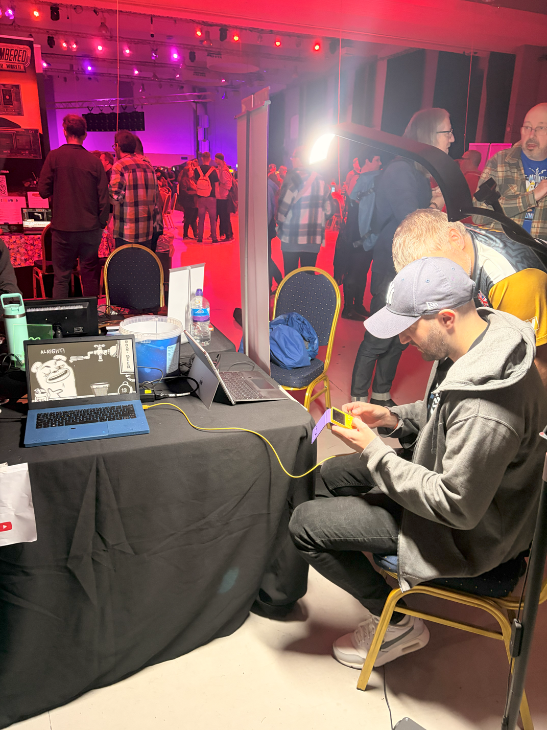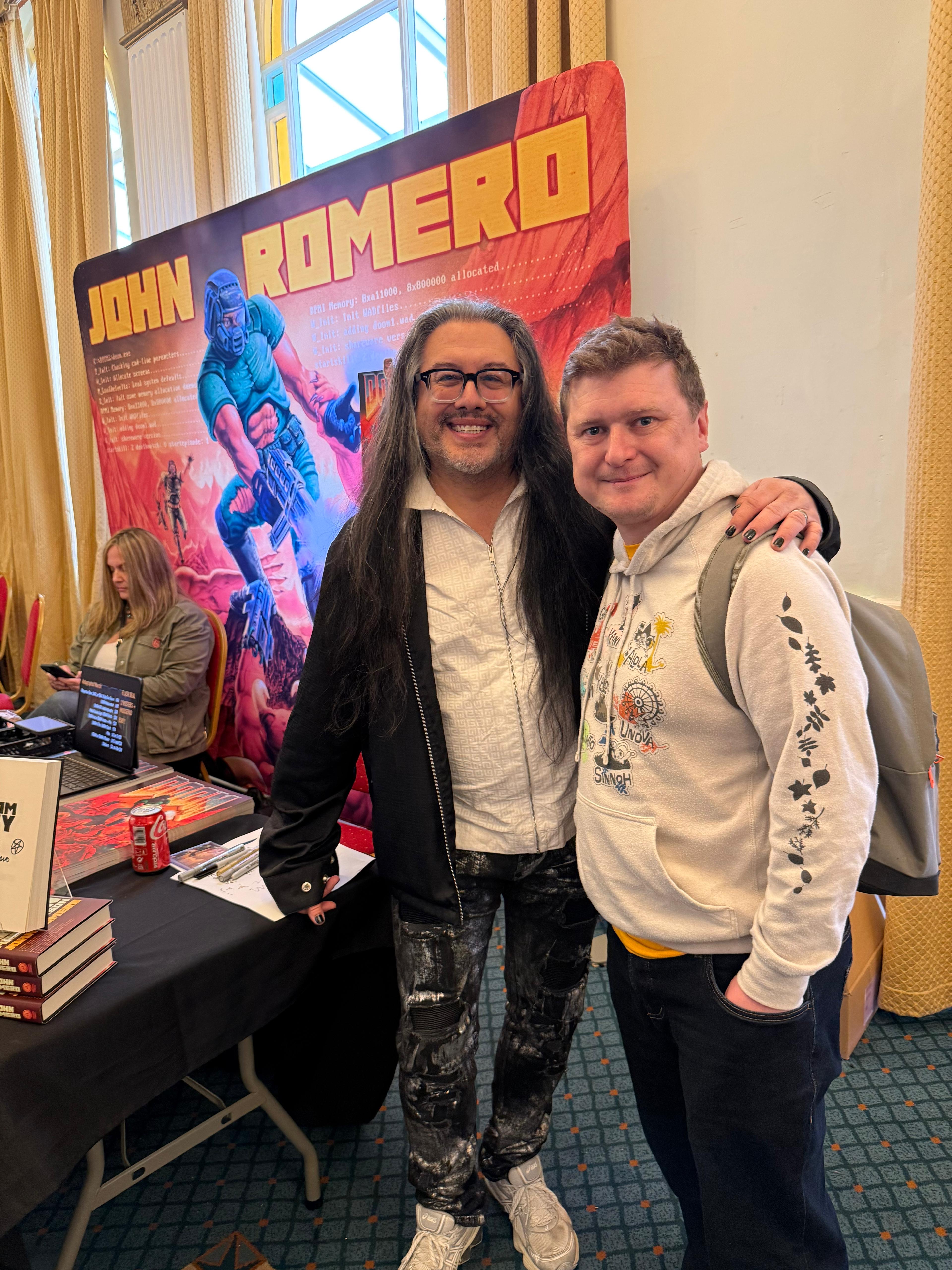 The plan was to have a setup that I could throw all the expensive items (laptops and playdate) into a backpack to easily nip to lunch or the bathroom in breaks (or in my case to play pinball and have a quick photo with legendary doom creator John Romero).