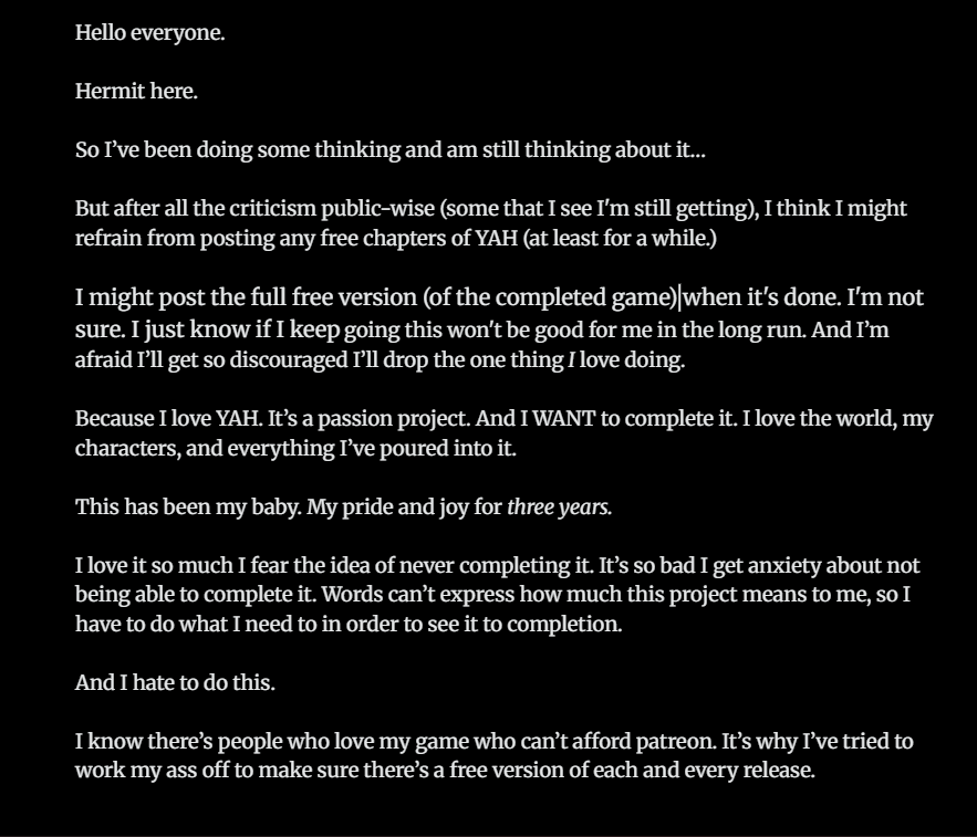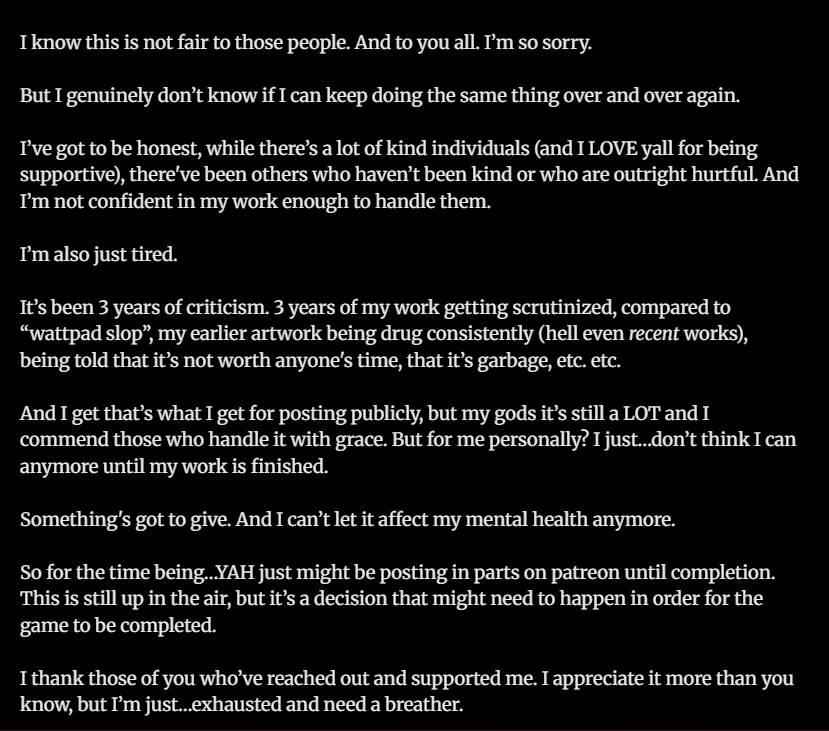 People who hide behind their internet anonymity to insult and belittle others are losers. Plain and simple, pathetic losers. I'm so sorry you've been receiving such hate, I rarely look at comment sections because I am very sensitive to criticism (founded or not) and even when it's not directed at me it hurts, so I completely understand you stepping back. At the end of the day, you are more important any game or project could ever be, and you should always put your health and wellbeing first. I love YAH for both the story and art, and I am willing to wait for as long it takes for you to finish it, so please take breaks if you do need them. I can only hope you feel better in the future, and that the losers making hateful comments actually get lives and hobbies and stop attempting to drag others into their own pitiful misery.