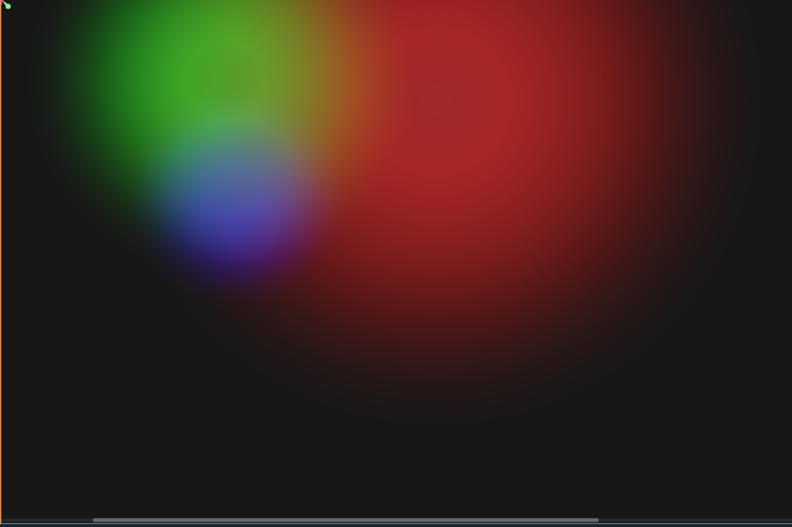 Next up I wanted to add alpha variance and colors so we could control the hue of our lights. After about an hour of tinkering and playing I had this. It was at this point I was getting confident that I could actually do this. So now we have a rect with something resembling lights and I was about to encounter a problem I was blissfully ignorant of up till now. Screen space. I was not aware how much of a pain this kind of is, or the issues that it would cause with color mixing.