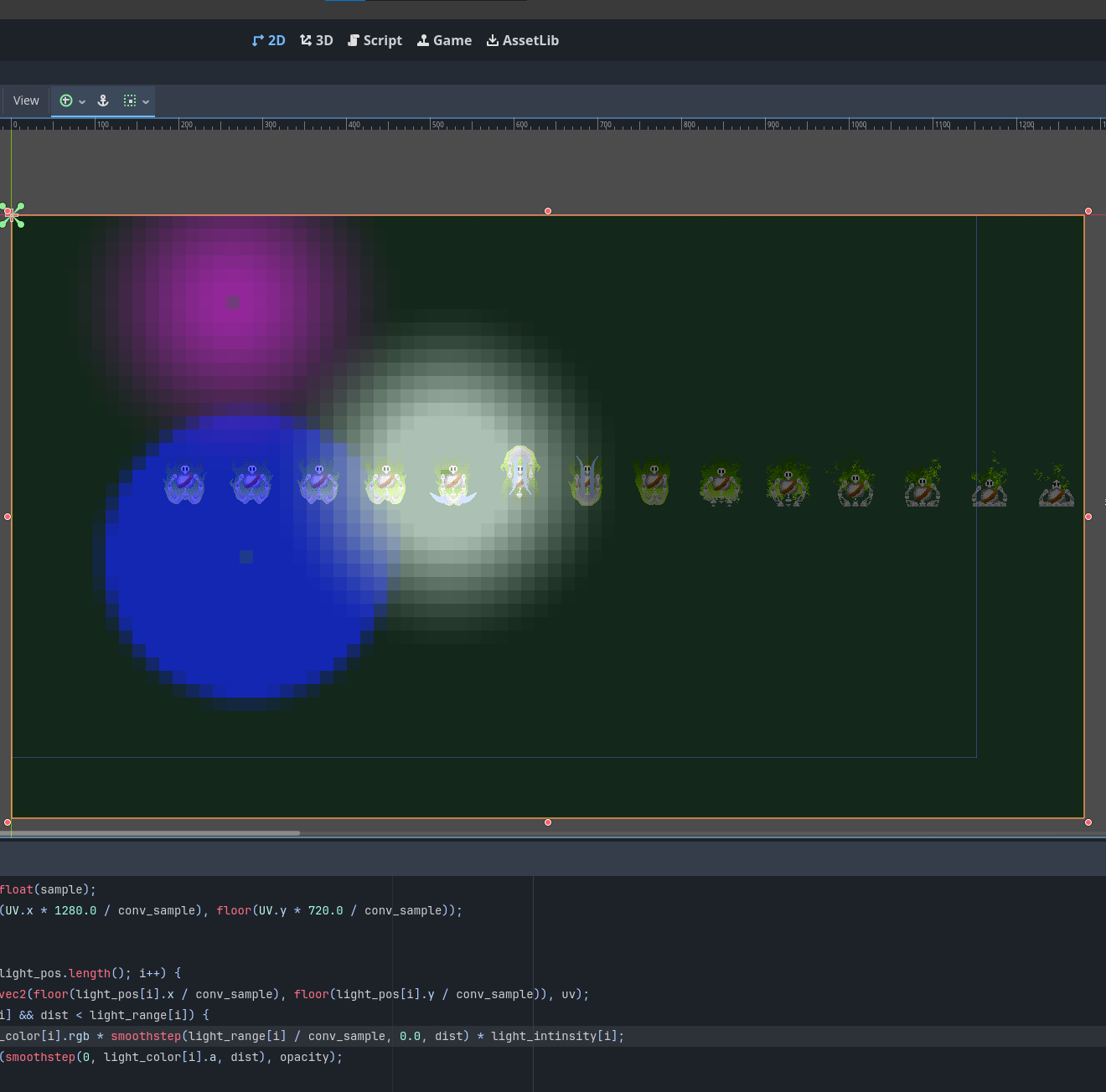 The shader effectively contains a few arrays of a fixed size that store position, range, color, state, and some other settings. So I needed a way to actually update those settings at runtime since the GPU isn't aware of the game and is only aware of the texture info. So I created a class to manage the lights. In the simplest terms the class keeps track of unused indices and if a light is added to the scene it asks for one of those indices. That index can then be passed to some other methods in the manager to update that indexes setting in the shader. This doesn't do anything on its own though. We need to create an scene that can act as our light. I created a scene around a marker 2D that I can use as a base for my lights. I did this mainly for the marker extents variable. I wired that directly to the range so setting up lights initially and animating them is a bit easier. The class exports the color, and some other minor settings that we can update if we need. And that's that, we have a functioning system!