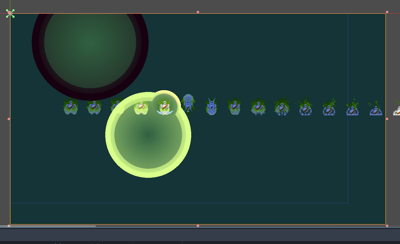 This is what the final implementation in game looked like, but now we had to tackle the next issue in game. You see most of the particles in game should be fairly bright, and pop in the dark! That hasn't been the case for awhile, but with the experience I gained working on the system above I thought I was ready to tackle everything. This lead me to learning about the back buffer copy node, which while very cool, turned out to not be needed. I ended up iterating on my existing glowing particle shader that didn't really work and having it consider the screen when rendering. This initially lead to some very interesting behavior like the sprites "disappearing" when the particles appeared. I ended up discovering this was caused by reading the screen texture prior to those sprites being rendered.
