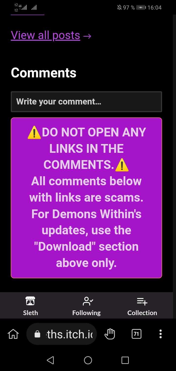 Hey everyone, I don't know what's up with Itch, but there has been a MASSIVE increase in scam bots in the past few months, and now they somehow got even worse, with 4-5 scam comments A DAY that I have to keep reporting, banning, and deleting from the main game's page...