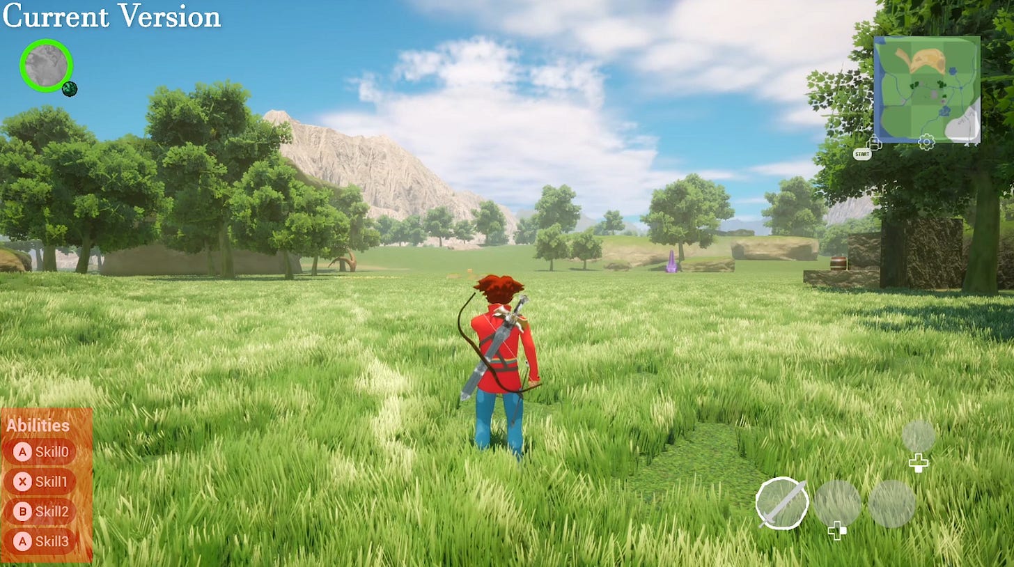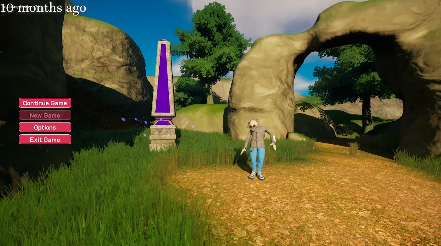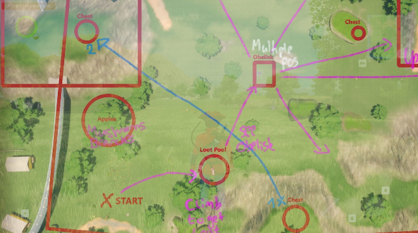Alright, so when we start the game in the Demo map, I expect the player to go forward, and they will immediately spot the left trees and big rock - on the right, the structure with barrels close to it and the monster or obelisk in the distance.
