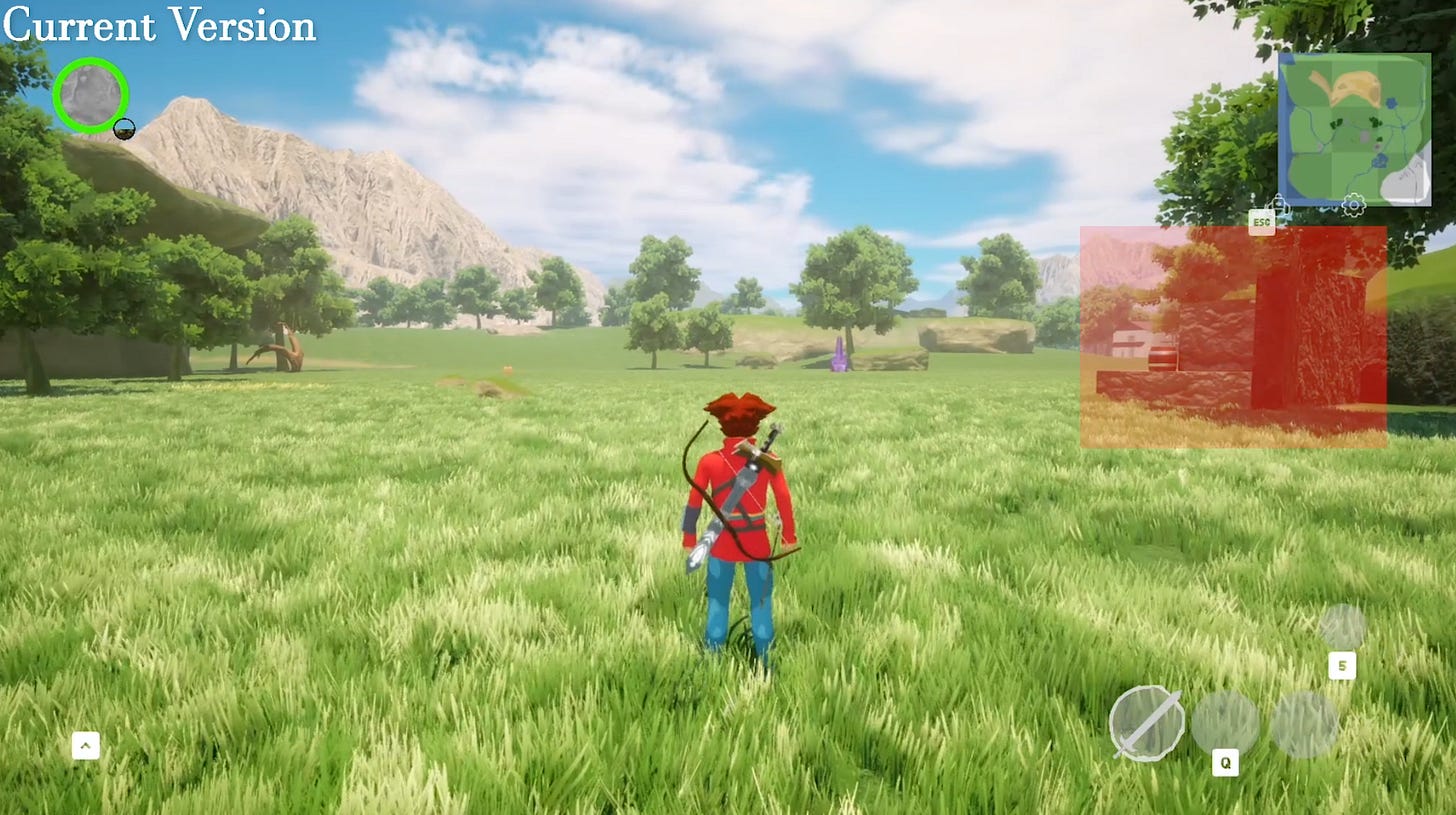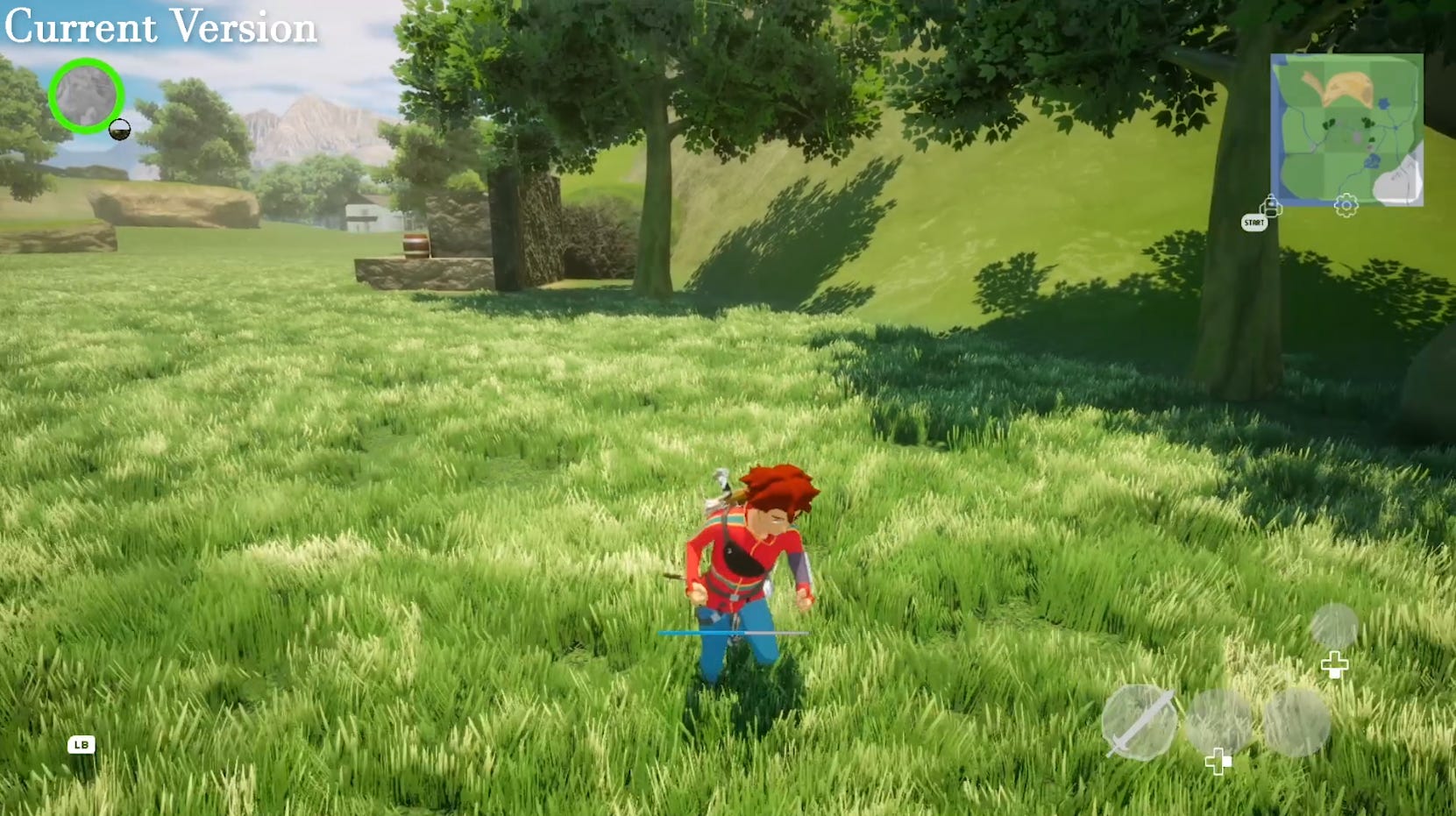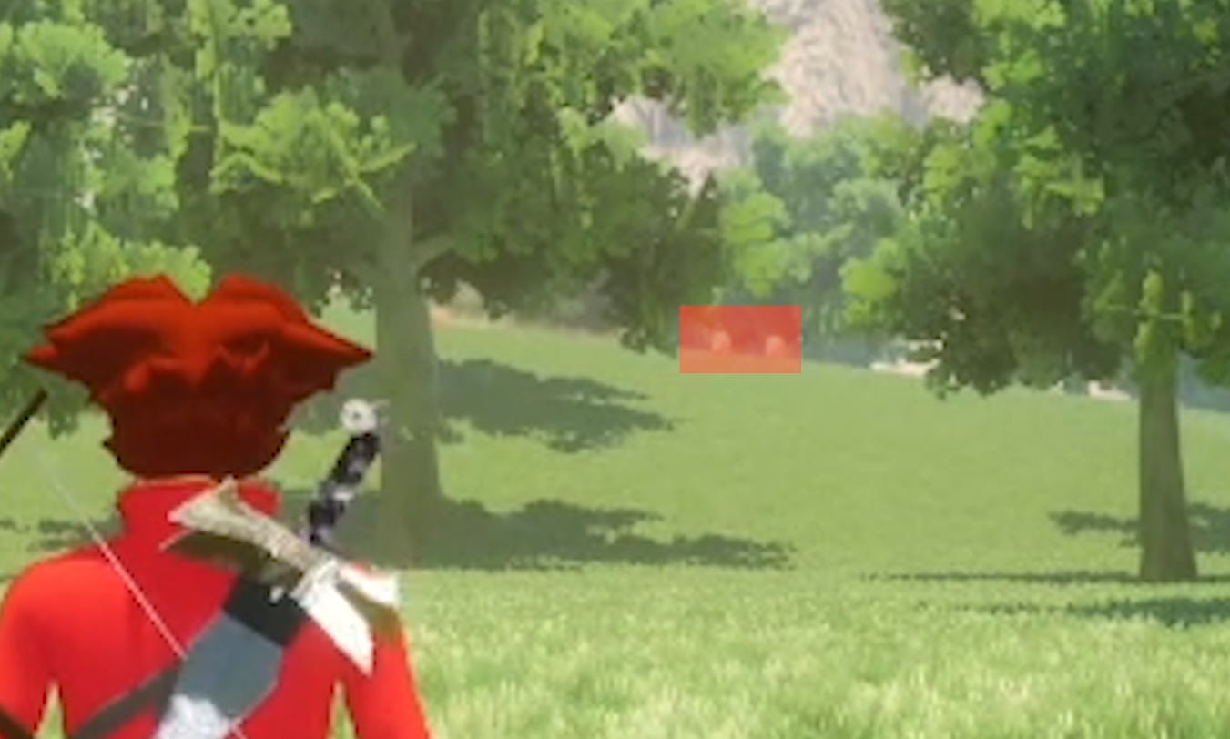 Alright, so when we start the game in the Demo map, I expect the player to go forward, and they will immediately spot the left trees and big rock - on the right, the structure with barrels close to it and the monster or obelisk in the distance.
