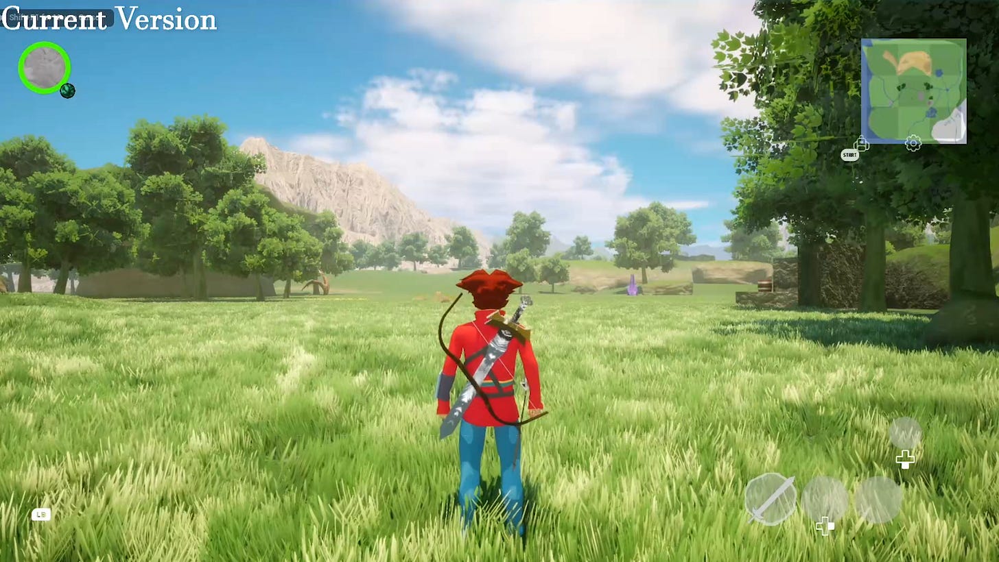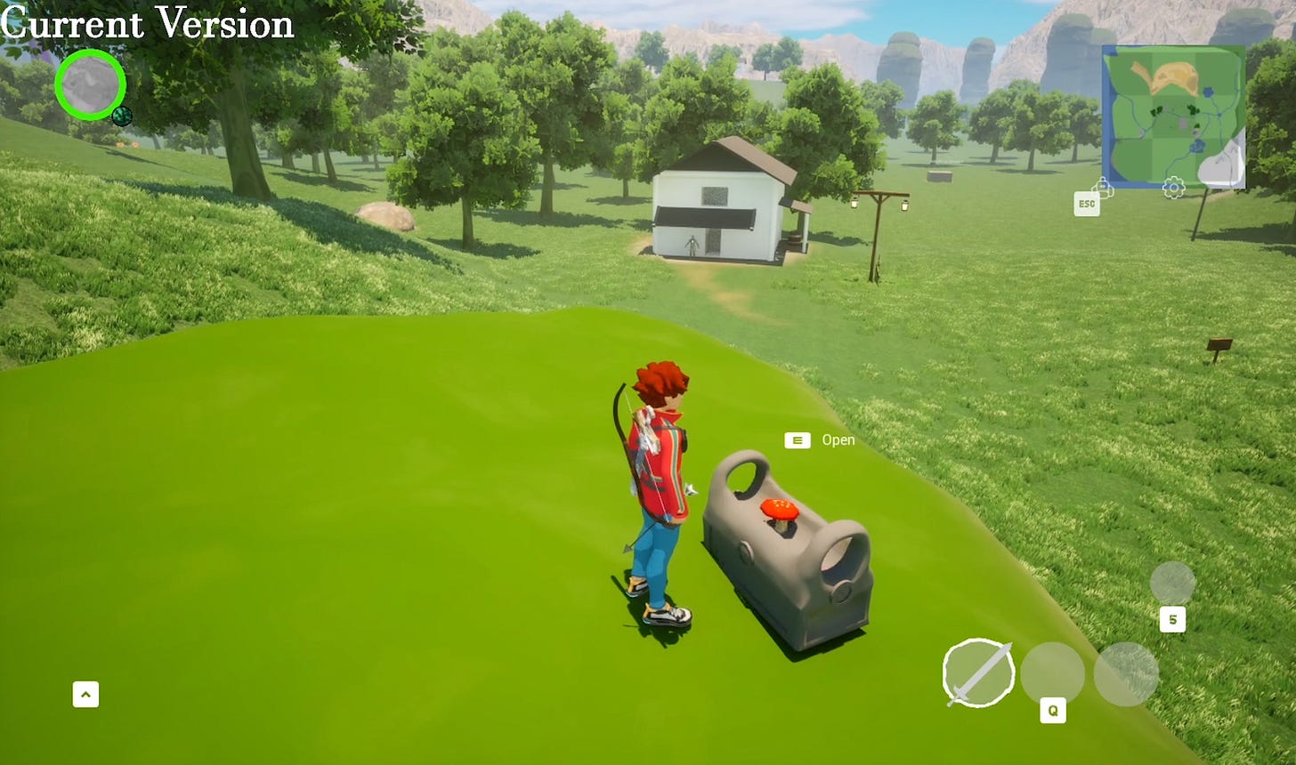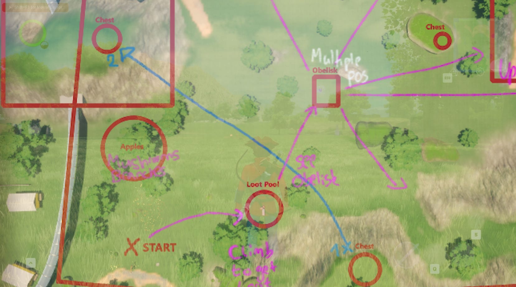The structure on the right serves to solve multiple problems, to showcase, that the player can jump and climb onto things, and to pick up the equipment on it and equip it in the pause menu.