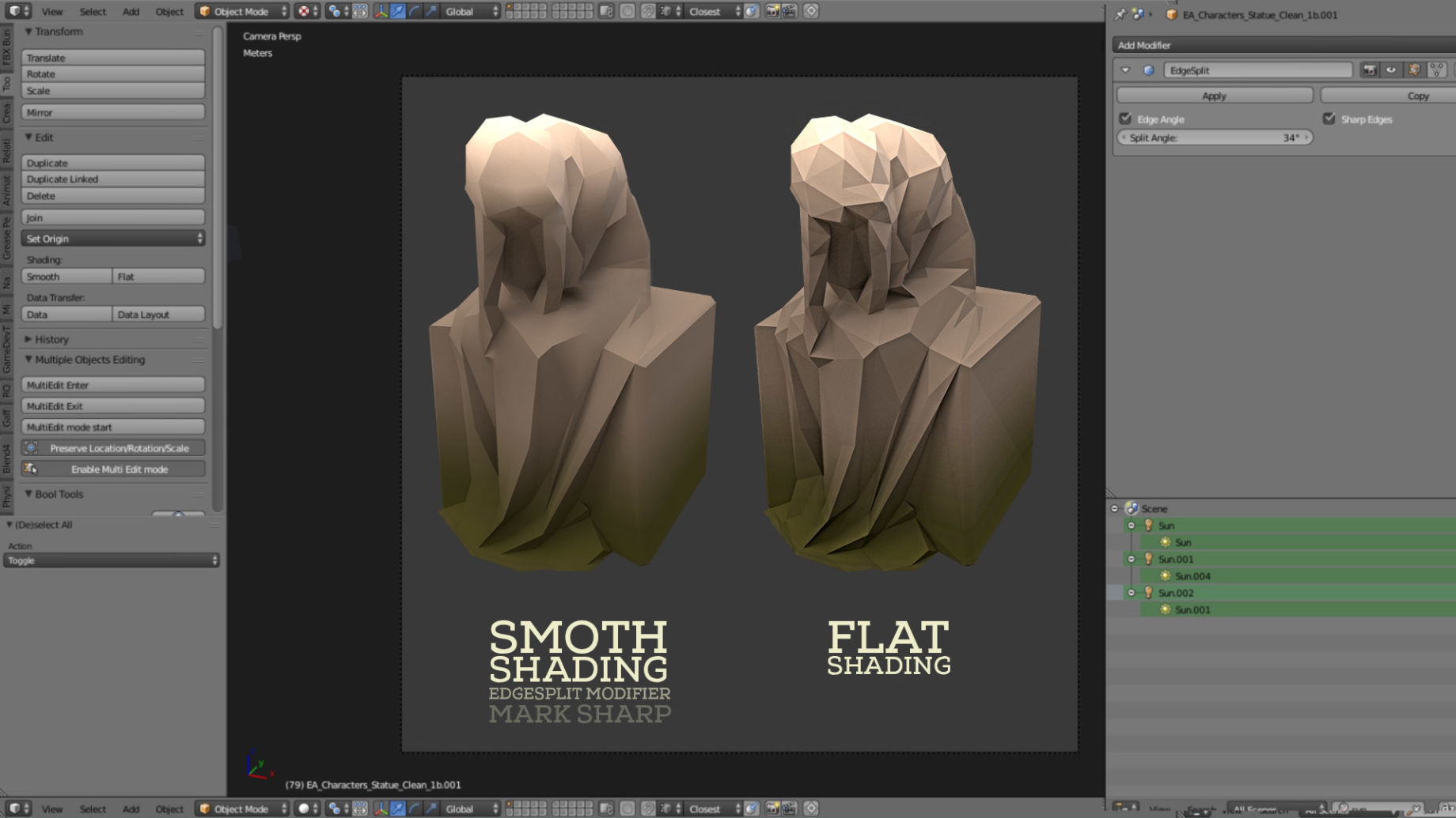The style of my objects is not completely flat. When modeling assets in Blender, I started to use face smooth shading or Edge modifier, using marks Sharp and operating normals in data models. These new methods let me achieve more interesting surface structures. What I mean is that they are more oval, smoother and as if they were sculpted. But BE AWARE that this is not done at the cost of the geometrical density of the model. The number of tris in such a model stays the same as in the models made with the original method.
