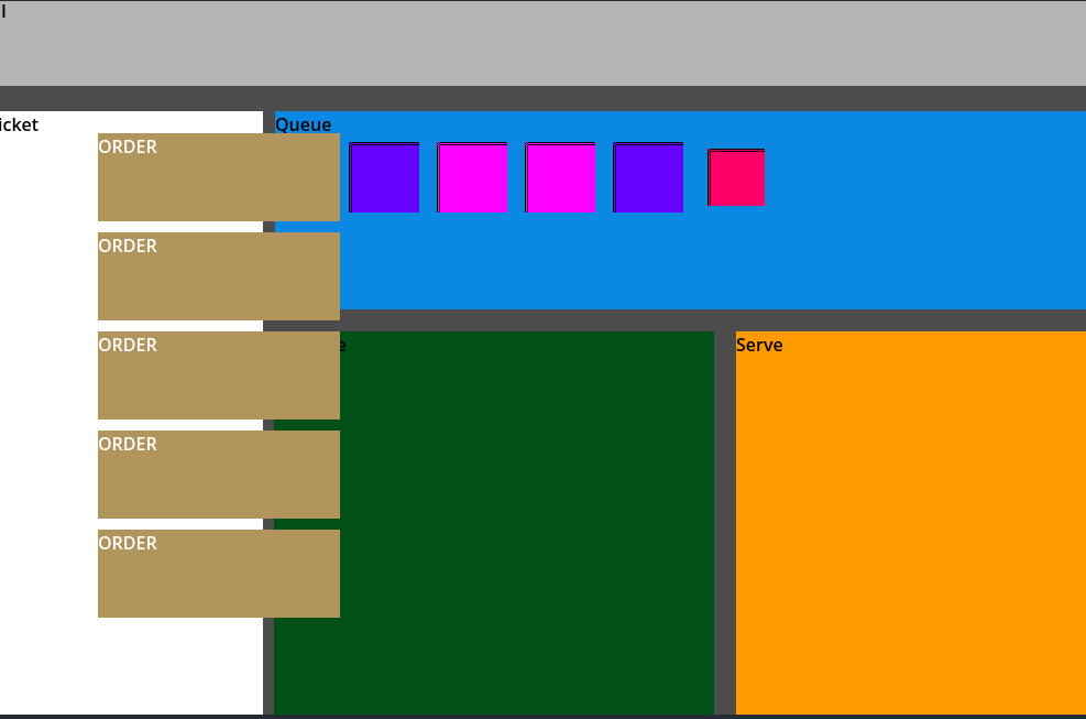 This shot shows the first version of customers spawning into the queue area. The bright squares represent customers. At this stage, tickets were still spawning underneath the machine area instead of on top of it—so it looks a little wild.