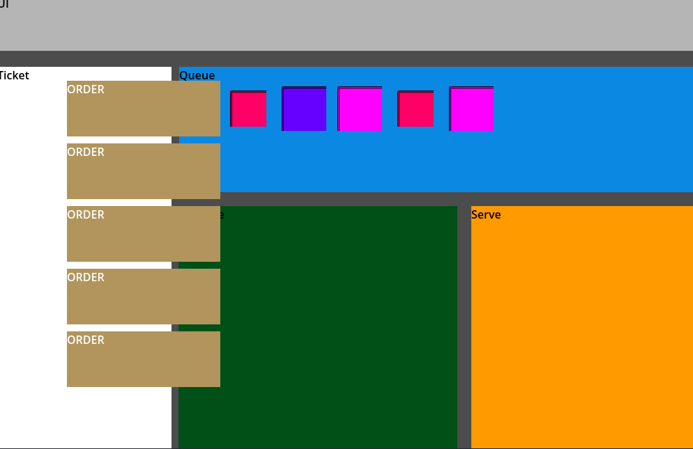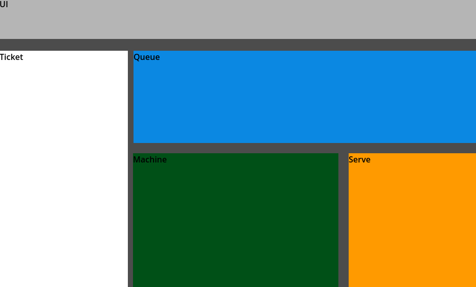 Here the ticket system is finally behaving. Even though at this time i didn’t have them loaded in. I added region labels like “Queue,” “Ticket,” “Machine,” and “Serve” to keep everything clear while wiring things up.