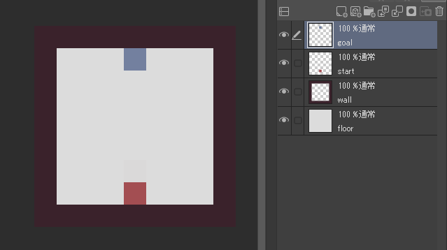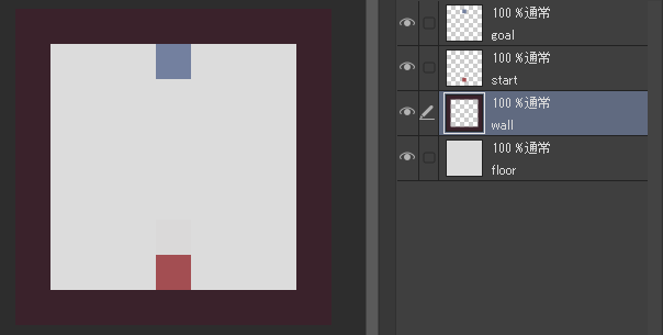 もしクリップスタジオがあるなら00map.clipを、無いならレイヤー機能のあるお絵描きソフトでfloor.png、goal.png、start.png、wall.pngを別レイヤーにして取り込んでください。