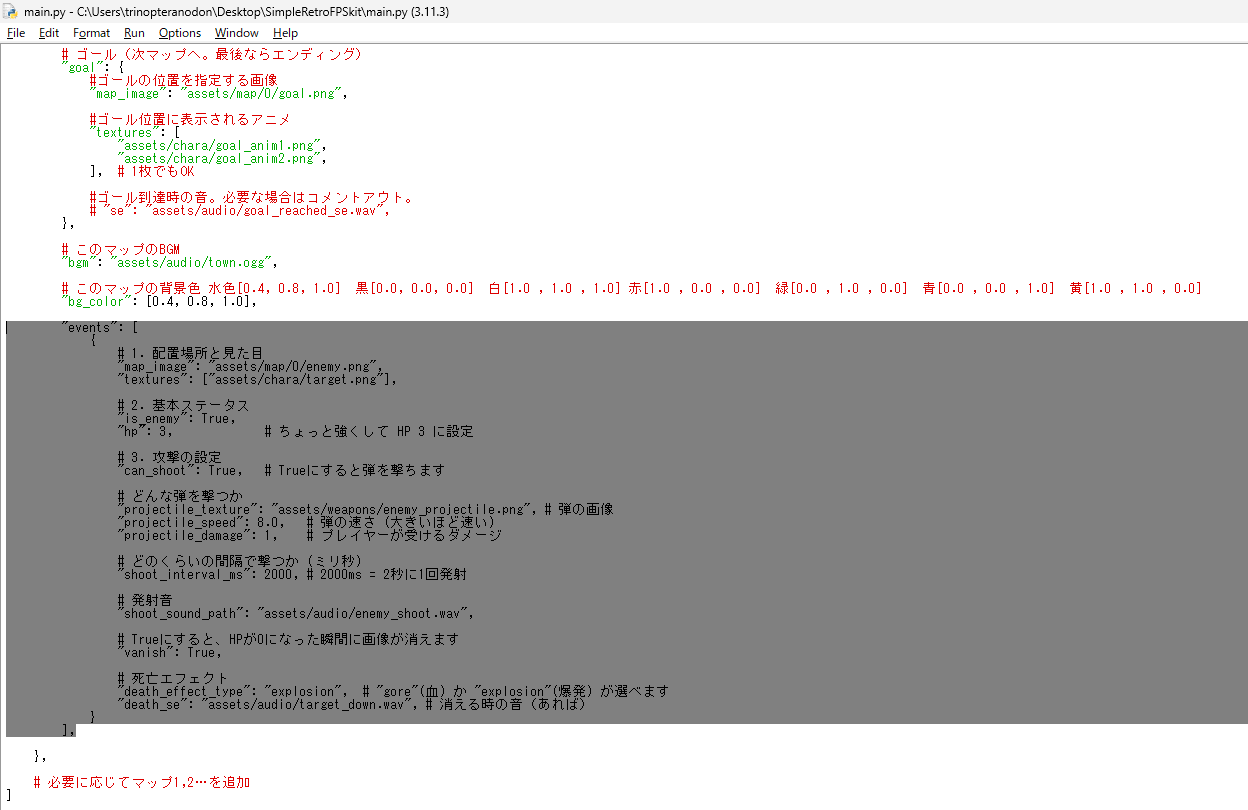 起動したらFile→OpenでSimpleRetroFPSkitフォルダ内のmain.pyを開きます。