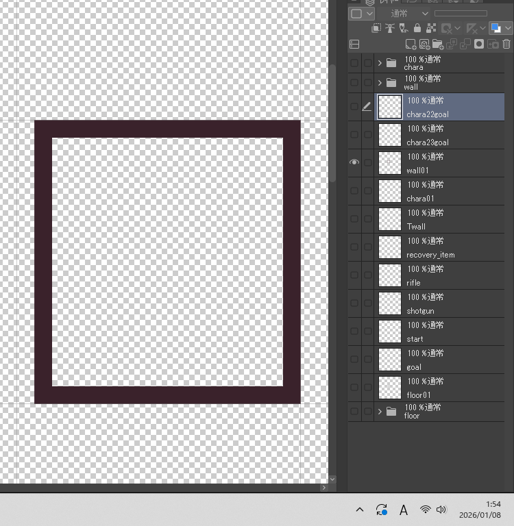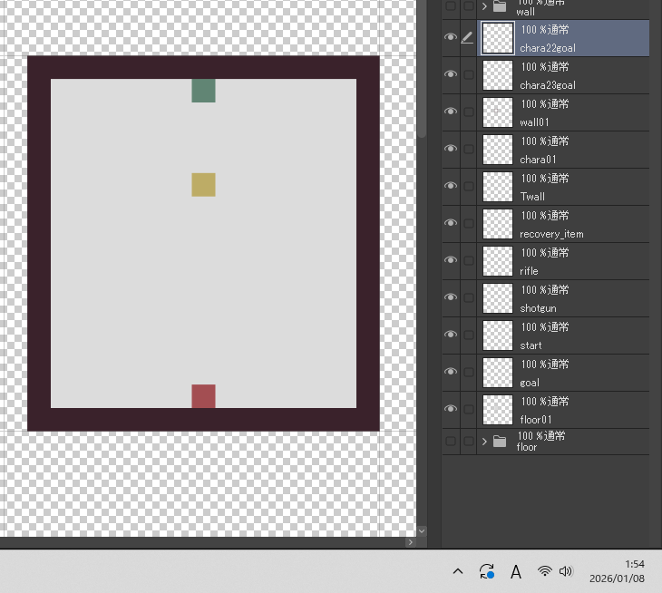 そのレイヤーの名前でレイヤーの画像だけをpngファイルで書きだすと、それをmain.pyというファイルが読み込みゲーム内のマップに壁や床、アイテム、敵が配置されます。