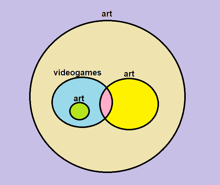The other, stickier, way that we mean art in this question is the art that’s in museums (like MoMA or the Met), art galleries, and art schools. Whereas the first definition of art is a big umbrella, this one is on the same level as 'videogame'. While there can be overlap in things that fall in the Venn diagram of both art and videogames, they are still two separate things.