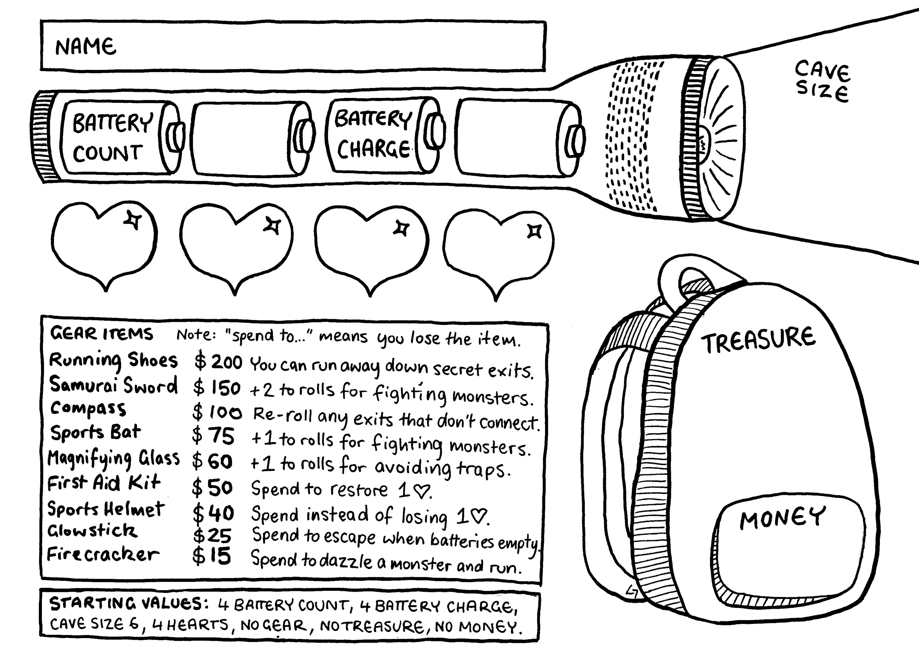 That’s your character, dungeon generation with 9 different themes, light, secret doors, trap handling, monsters and combat, hp, boss fights, treasure, progression, rest, healing, town and town map, shopping, special gear, and difficulty scaling as the cave increases in size.