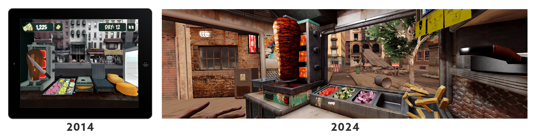 The idea was simple, but the vision evolved over the years. At first it was to be a mobile game — in those years kitchen time-management titles, where you prepared orders on time, were still quite popular. I wanted to add zombies, which were at their peak in 2012. This concept helped me get a job in mobile games. I thought I would quickly learn how to make games and release my project — a combination of Cooking Fever and Into the Dead. Two mobile prototypes were created, but the feedback was clear: shooting zombies on a phone is mediocre. Limitations in control precision, a small workspace and a stationary camera meant that it just didn’t work.