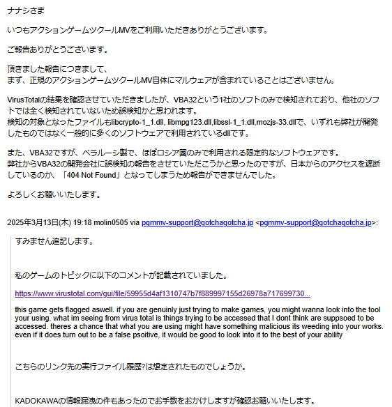 Recently, we received a comment that this game was suspected to be malware, so we investigated and found that VBA32 had recognized this game as malware on VirusTotal, a website that uses various diagnostic tools to simulate malware diagnosis results.