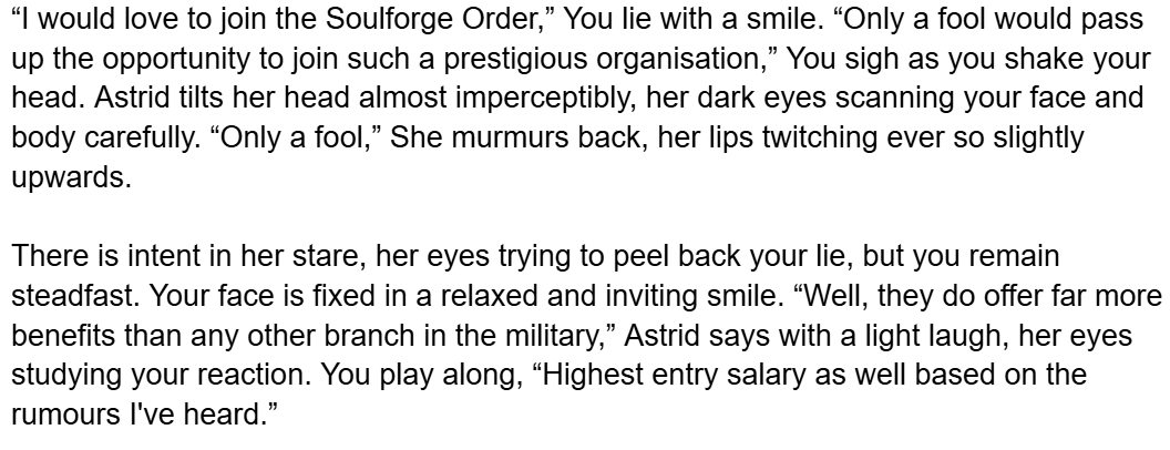 I'm happy to report that I have finished Astrid's campsite conversation! I spent quite a bit of time hopping around this chapter because I would often suffer writing blocks for specific scenes. Astrid and Nico's campsite chat was one of them.