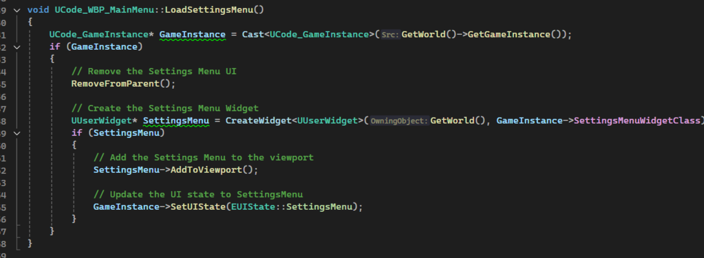 I was struggling with getting a good system for my Menu UI going to transition from the main menu to the settings menu and back. There is also a Settings and Pause menu as well that would need tracked between the transitions since you can access settings in the pause or main menu. The level transition and UI is very important for any game and to have a good framework for later to build off of since this one will be a roguelike so how it is set up is crucial. The UI and level transitions took a bit of time to get through as we did not have a gameplay loop fully set up yet so the system, I was attempting to envision was hard to picture.