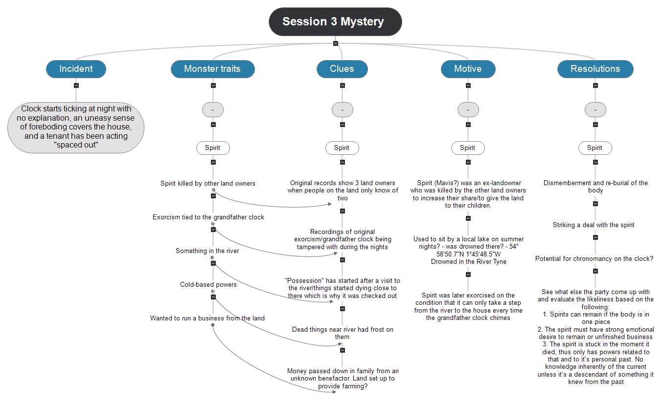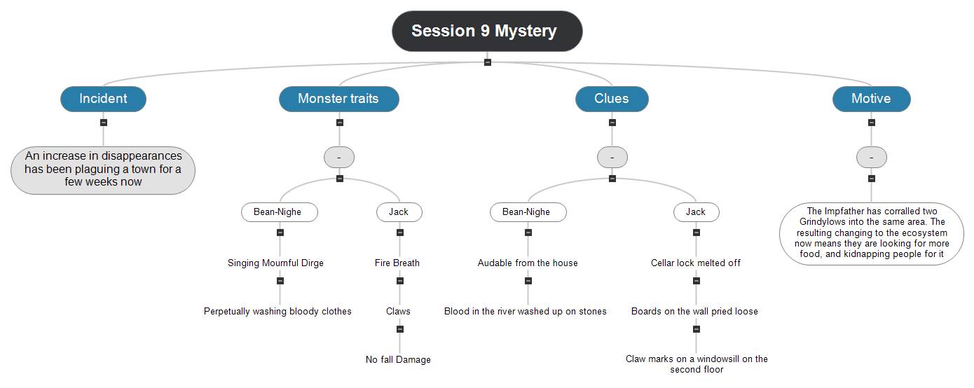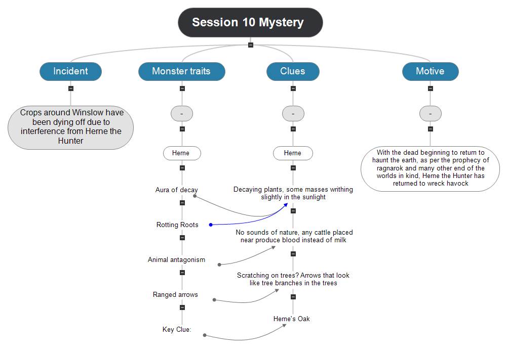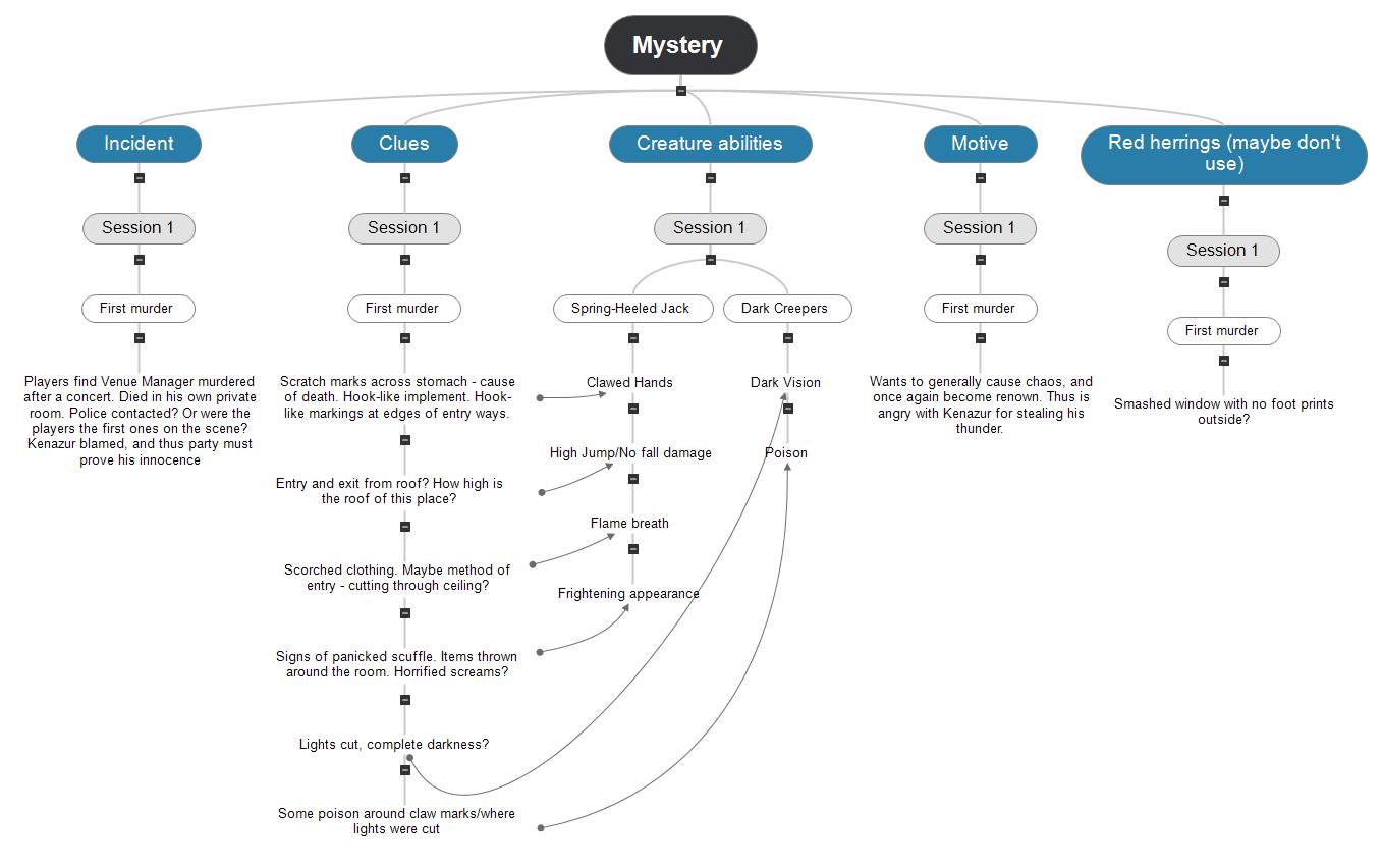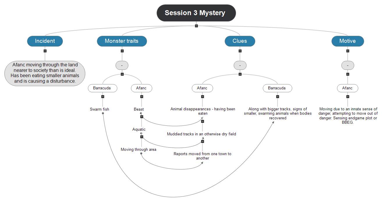 For the Pathfinder First Edition game that I ran, I introduced mystery elements. Below are the various diagrams and mind maps that I used to figure out the plot for most sessions: