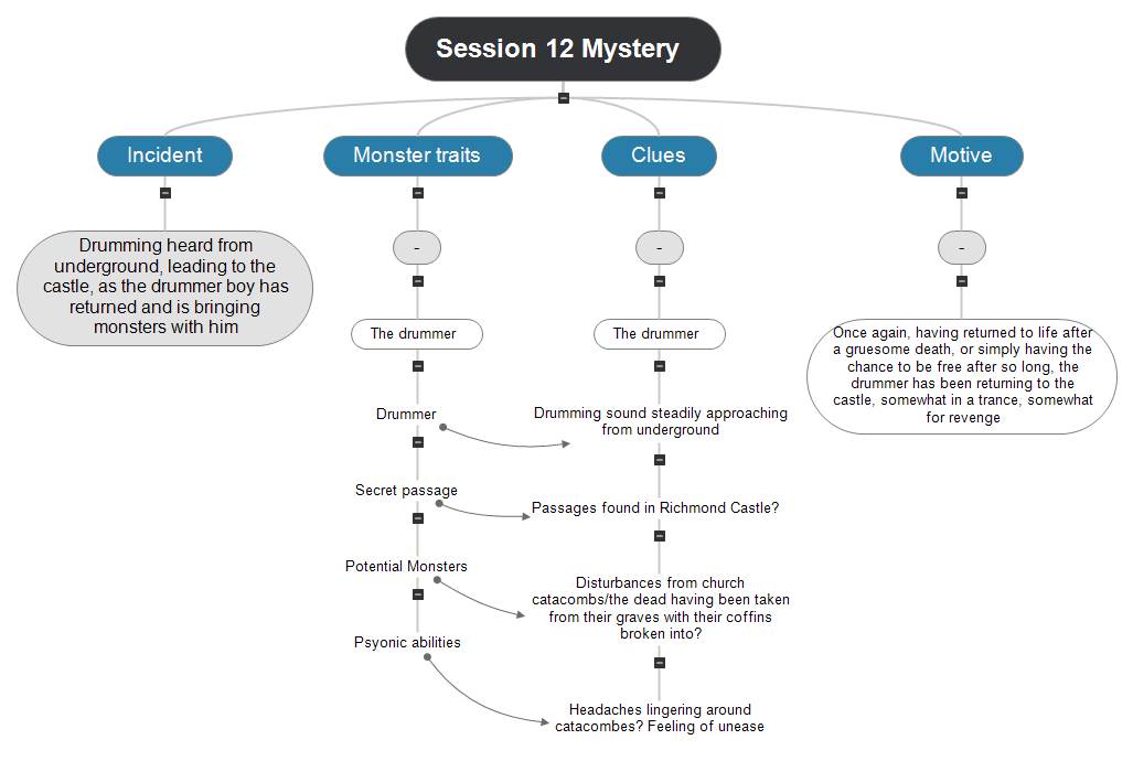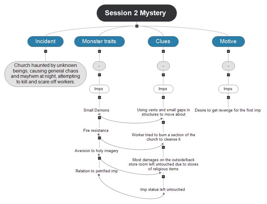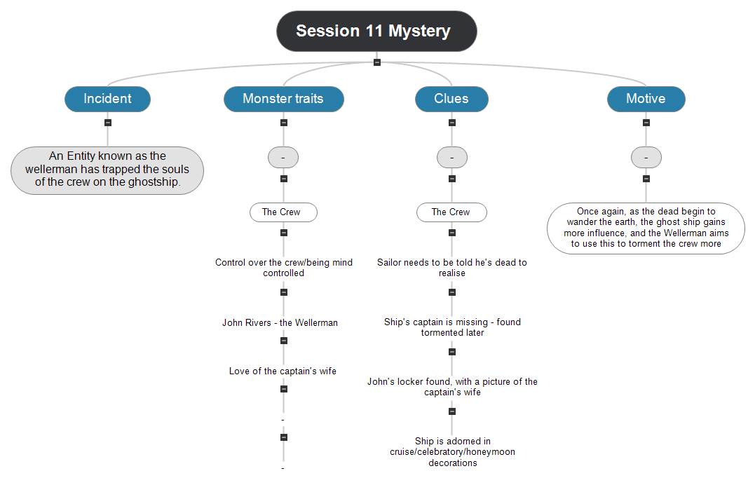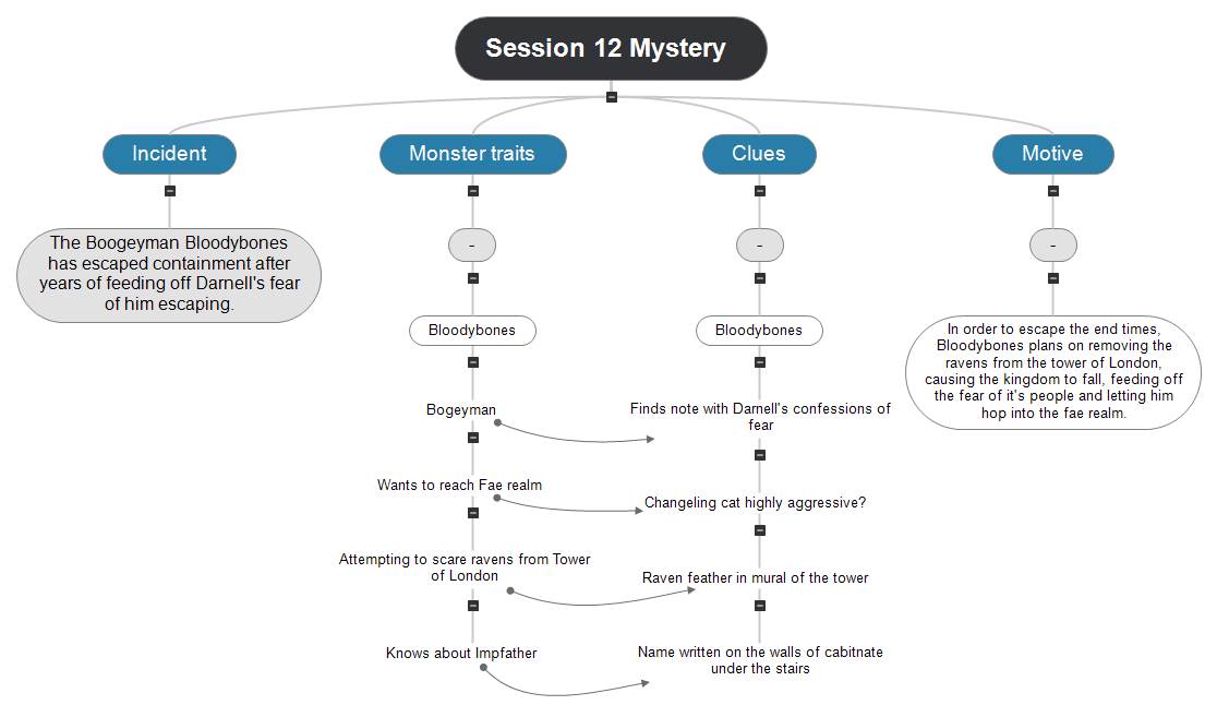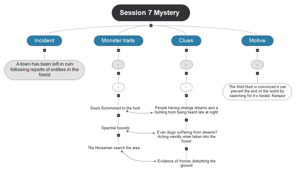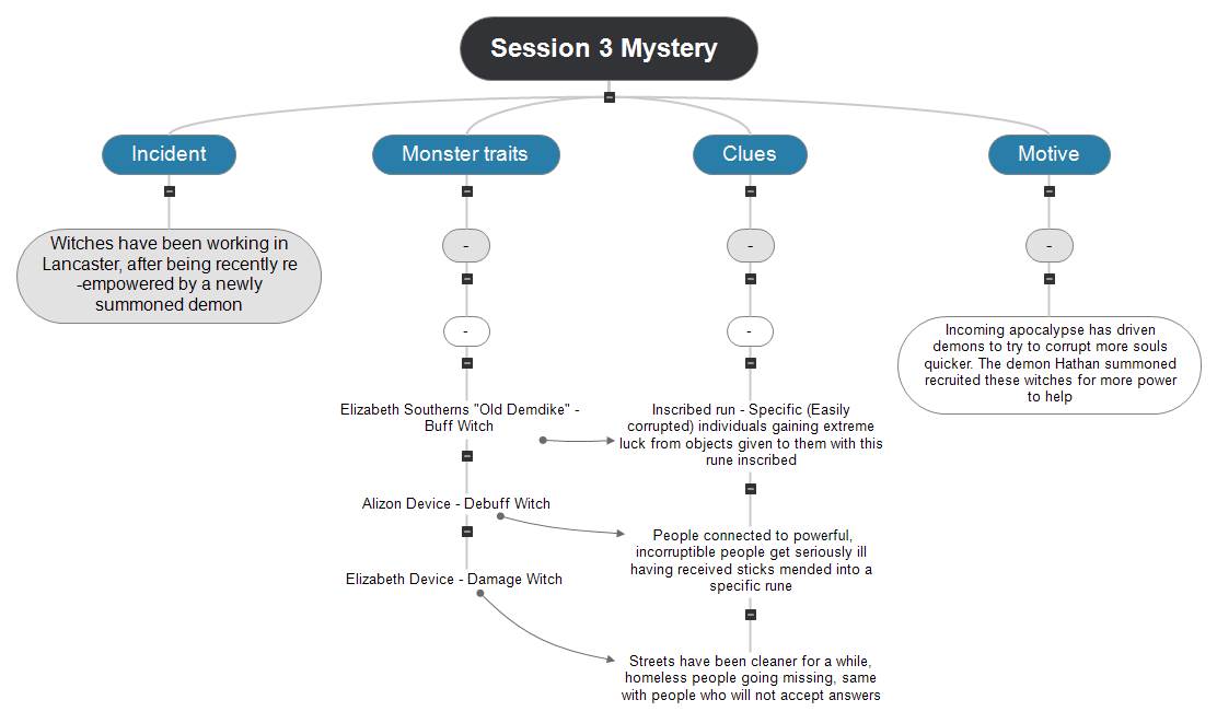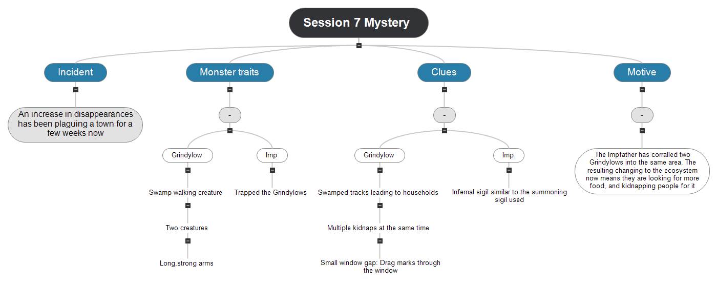For the Pathfinder First Edition game that I ran, I introduced mystery elements. Below are the various diagrams and mind maps that I used to figure out the plot for most sessions: