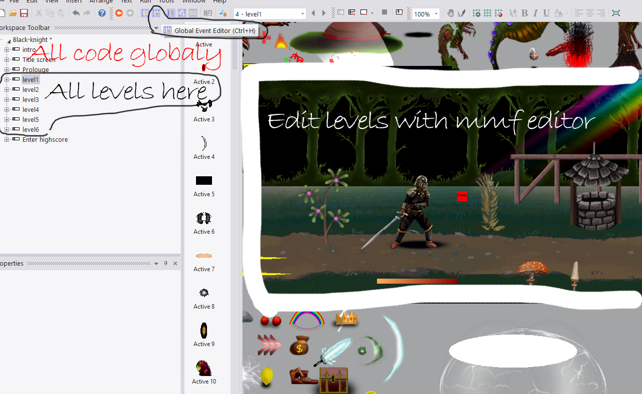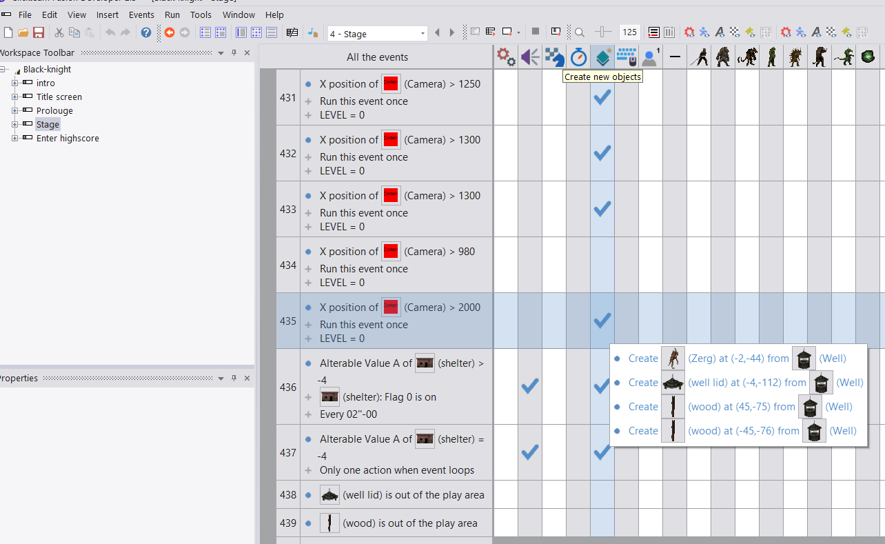 My goal is to make a simple level array so I can design the levels with visuals. Now I make the events like this "when screen moves to 1000 x pixel position then this happens. "spawn grafics and monsters." I have to retry the level from start over and over make it work and play somehow okey.