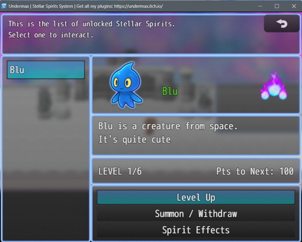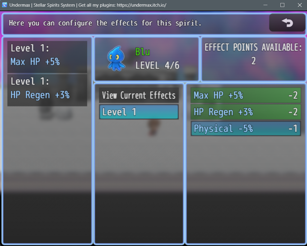 Each little creature can provide different effects, such as stats or special abilities for your characters. Choose which effects you want to activate/deactivate as the spirit unlocks new powers by leveling up.