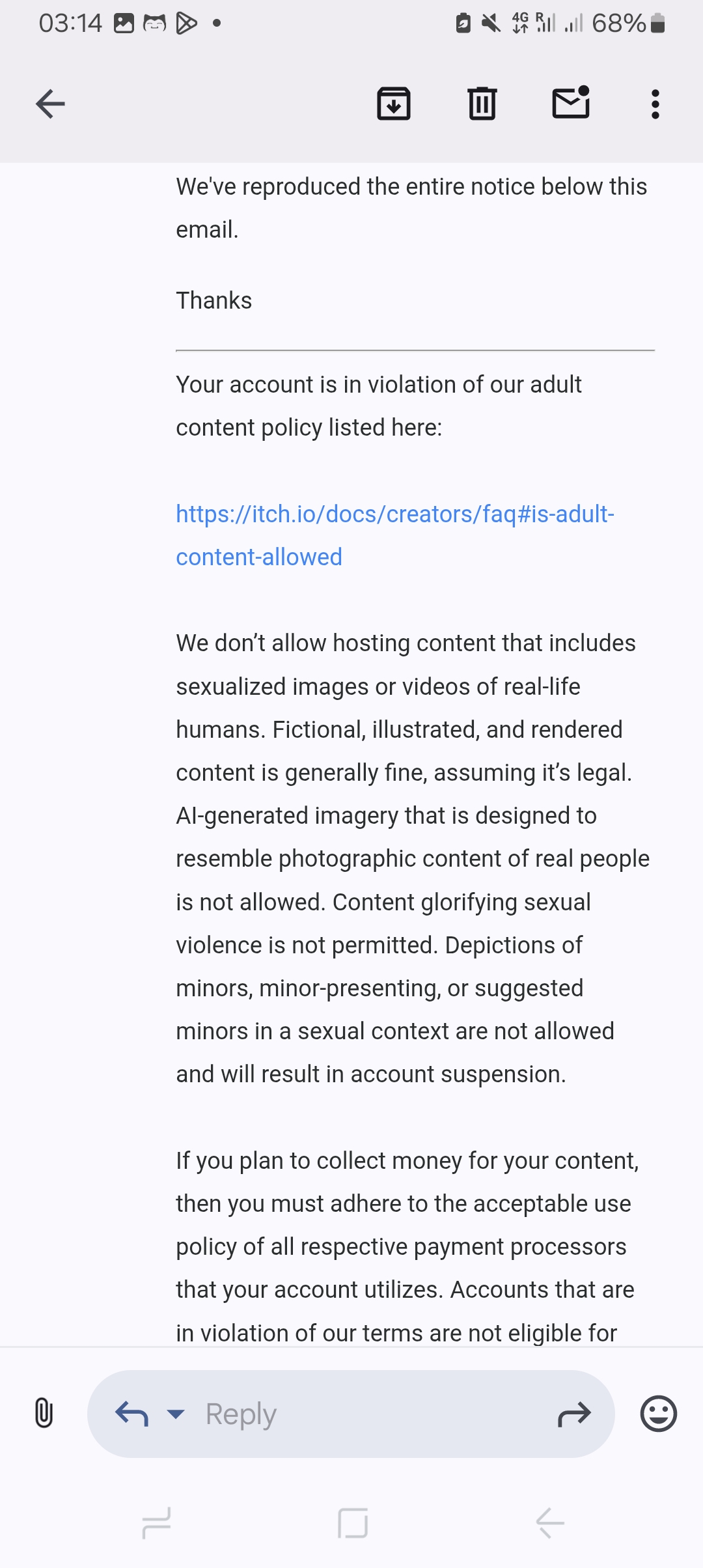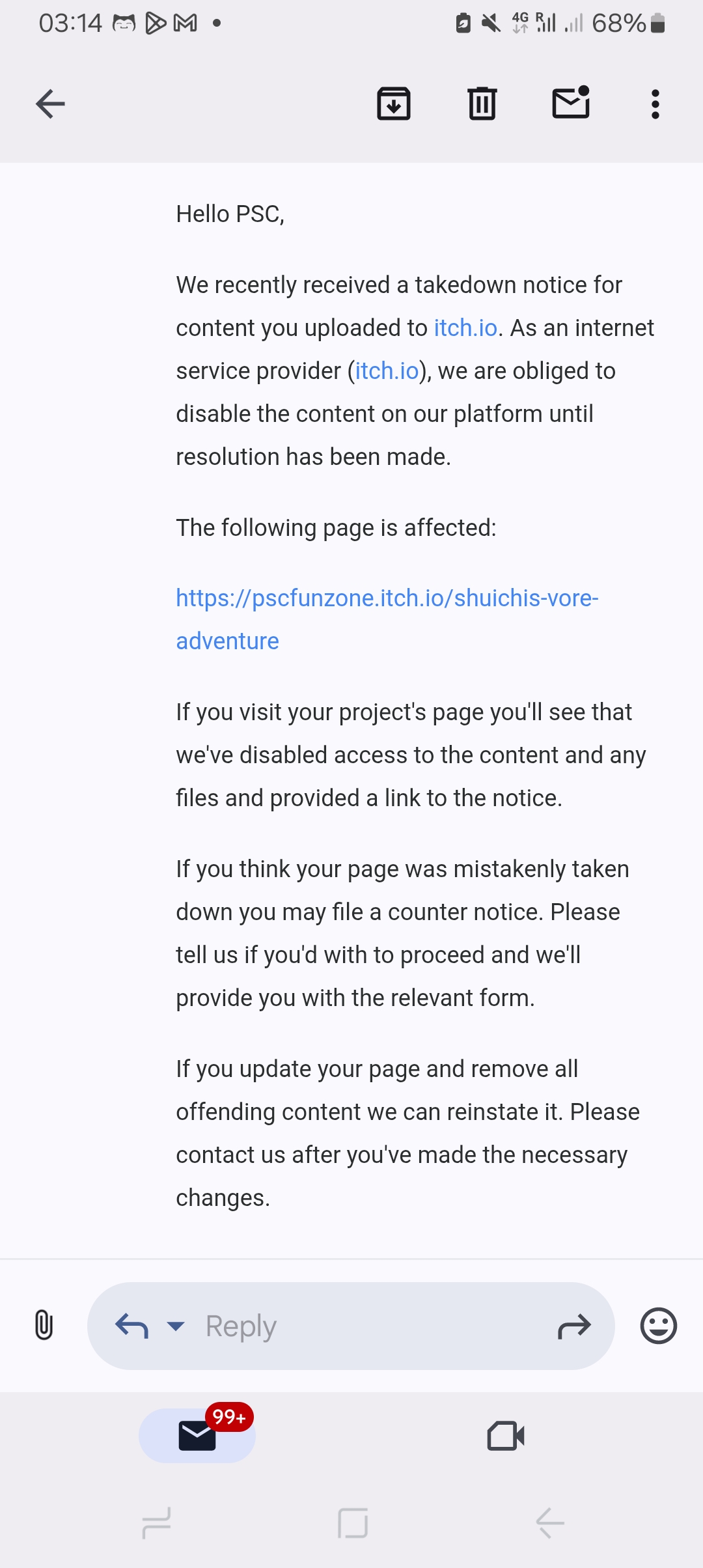 Not a devlog but a rant I guess? I am on break at the moment, working on a personal project, but this morning at 1:30 am I got this email telling me that Shuichi's Vore Adventure was under threat of suspension.