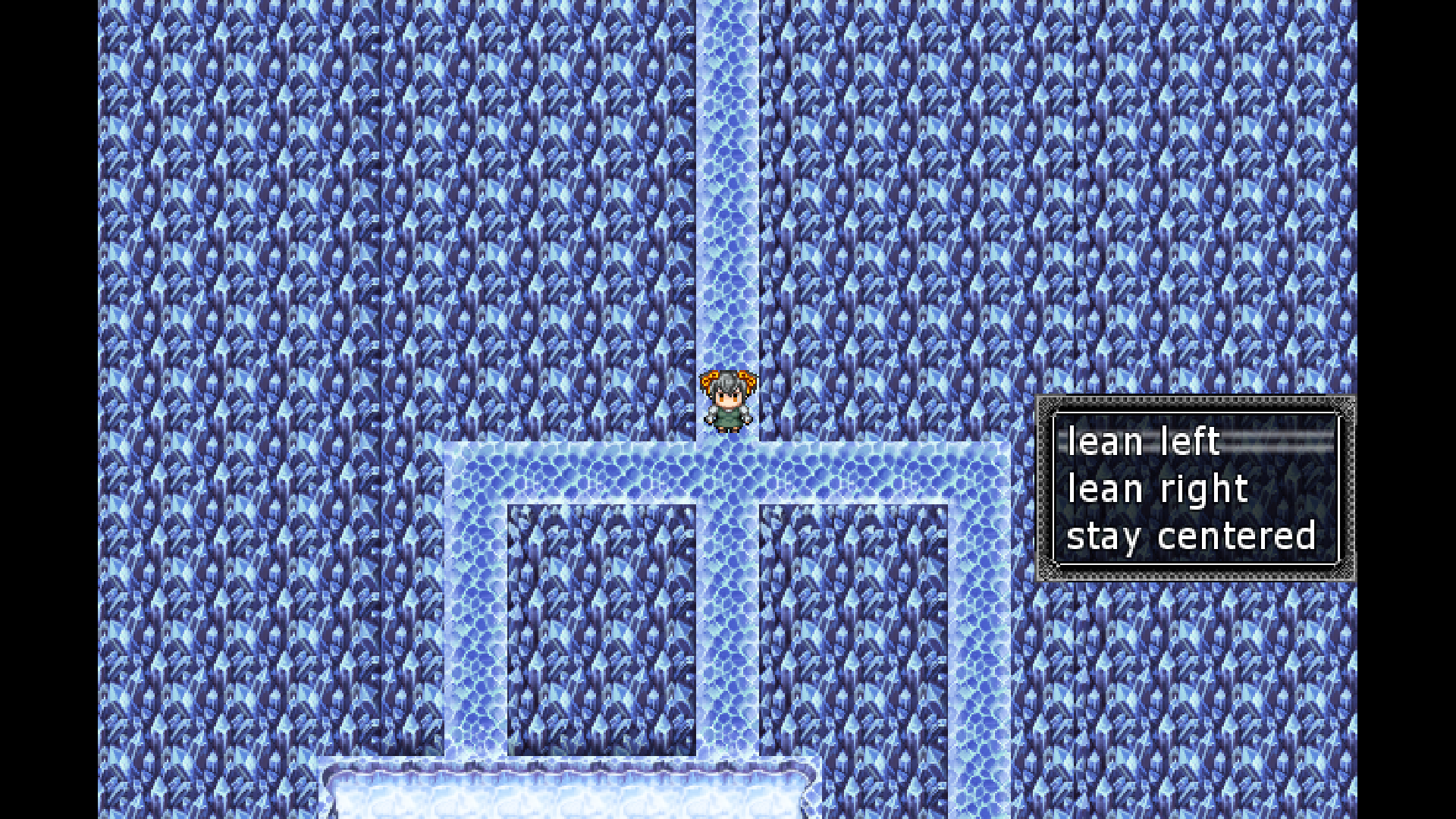 Continuing downward from the castle grounds will bring you into the ice stage. The first challenge of the ice stage is essentially a path-choosing memory game. Ana is sliding down an icy tunnel, and her only way of controlling where she goes is by leaning left or right or staying centered. In some areas, she can also make a 'hard right' or 'hard left' verses a regular right or left. The player will be prompted to choose a direction at each break in the slide. The first couple direction choices will always lead to the same place, but following the Save prompt, a wrong choice will result in a Game Over. The player can easily get through this area simply through trial-and-error, and I recommend keeping notes of the directions chosen to avoid any extra unnecessary deaths; however, if you're in a hurry, the correct directions are: