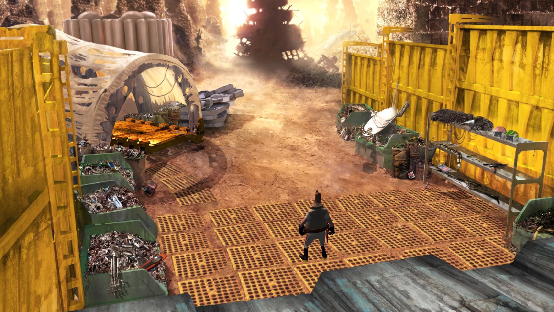 • Hot spots are not always there and I'm not sure why.  Perhaps it has something to do with different cursor types..  As one example, once I got the dog on the other side of the crates, I could not get him to interact with the crate movey thing. No hotspot there.  Eventually it just worked.  As another example, there is no indication that things can be moved on the desk.