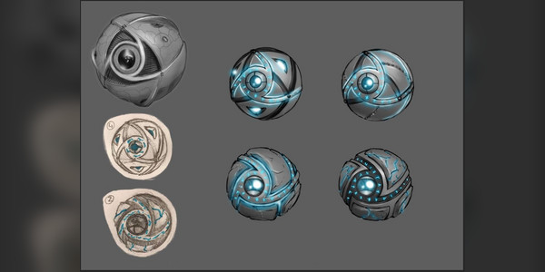Concept Art by Vanessa. Top - ball character concepts, middle - early level concept, bottom - grapple/magnet concept