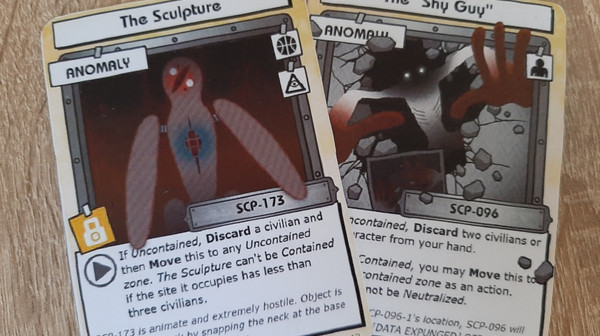 Since you can only Contain anomalies during your Action phase (because that's the only moment in your turn that you can a free action), you won't have time to Contain SCP-173 since it immediately moves to another site during your Start phase. Peanut is just annoying to Contain, but it's not that hard to deal with. You can just Neutralize it, or also use a Scientist to Suspend it and prevent it from moving.