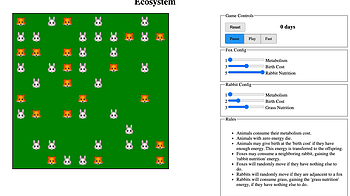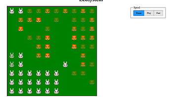 This release introduces randomness for choices where an animal has multiple valid targets. In the previous deterministic world, anminals would always choose the first valid target, leading to behavior like foxes always gravitating to the top-right corner and starving there despite an abundance of rabbits on the map. Now that foxes move randomly, they quickly kill all the rabbits and then die of hunger.
