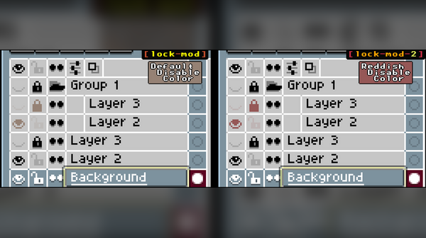 I also added a 3rd theme [lock-mod-2]. This is identical to [lock-mod] default, but has a slightly more reddish color to "disabled items" (like when you lock a whole Layer Group). Check the attached pictures.