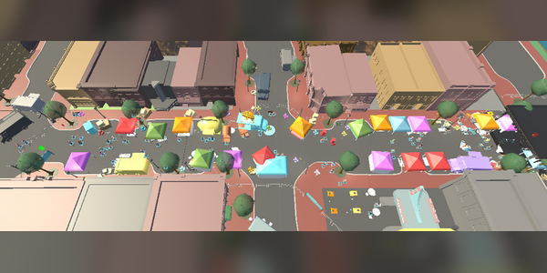 Right now, this first level acts as an intro to the longer, main gameplay events happening in the second one. I focused on creating a contrast between muted earth tones of buildings and landscape, with poppy fun colors of the festival tents and props.