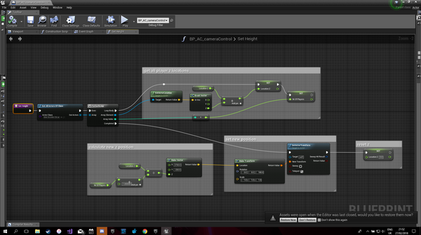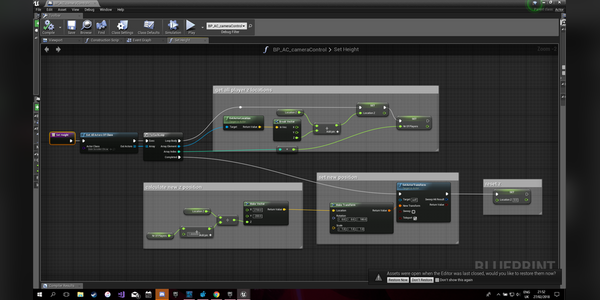 The camera works in a way that it will always have all the players on the screen, but won't encourage players to wander off far away on their own. Each tick the camera will retrieve all player z components (their height), take the average and match its own height accordingly. Because of the nature of averaging numbers out if the majority of players is on a certain height the camera will lean more to this height than that of players who are further away from the pack. Florian is thinking of improving this by also having the camera move further backwards if the height difference exceeds a certain threshold, but since testing has not presented such problems at this point this hasn't been implemented.
