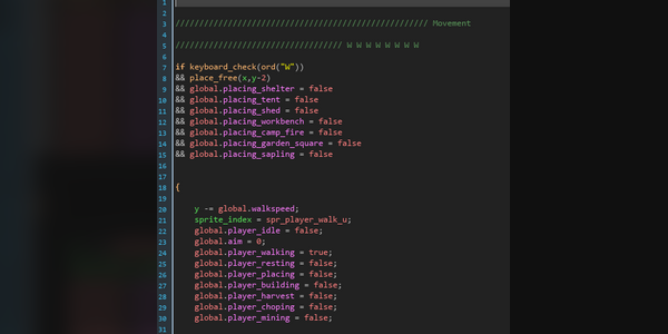 3. I started the most exciting PLAYER CODE! Yeah! This one will have a lot to add so I'm sure it will be a while as we create the art and animations. The player is always a chore, yet super important to test and get working well. So Far it is the "W,A,S,D" setup with animations.