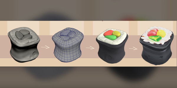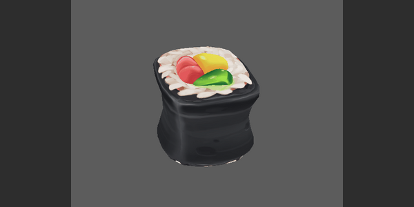 To get a rough time estimation, we made a little test run for one of our food assets: the sushi. Like already explained, the asset has to match the painterly style of the game. Therefore, we also created hand painted textures for our asset! We are not going to worry about PBR maps like roughness maps, since the asset will be in a flat-shaded environment anyway. All details like material definitions and highlights will be painted into the bae color.