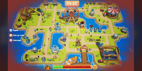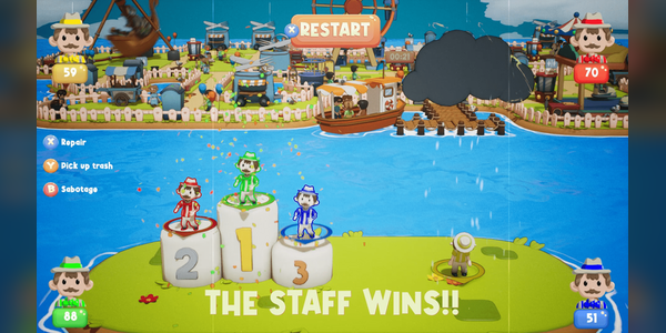The dunk tank and manager also have some new UI elements making it more clear when you're able to vote and where to put the player you've picked up. Our endscreen also got a lot better with a well deserved confetti celebration for the winner and a stormy cloud for the loser. We have added more clarity involving tasks using outlines around the objects you're repairing and adding a colored pulse around the trash. A lot of bug and crash fixing was also done. There was a timer added to the voting and end screen and the balance in points between the two teams has been improved.