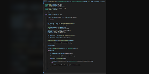 The CleanseRuleId is the flag for the censorship rule, which has a None field by default. the if(changed) check is the logic that triggers when I click on the button in the inspector. Using a static value set elsewhere, I can easily change the rule that I assign.