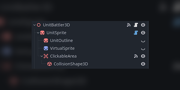 For starters, here is how the Sprite3D node is organized. It consists of a parent Node3D with a Sprite3D child. That Sprite3D has a Sprite2D child (we’ll call this our Virtual Sprite going forwards), and an Area3D with a BoxShape3D child. (The UnitOutline node can be ignored, as it’s not part of this solution.)