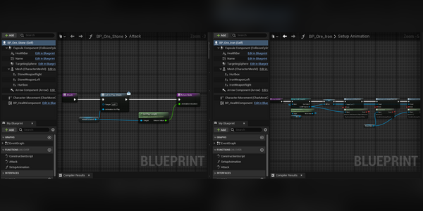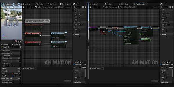 I decided that a lot of what I was having to do over and over can probably just be moved to the base class for the enemies so this next week I will be working on moving that stuff over so I can make new enemies faster but the one thing I wasn't sure of was all the work I had to setup in the ABP. Having to set that up every time also is a bit time consuming and since the enemies, at least the ore ones, are going to be using most of the same skeleton and animations, I was wondering if I could make a base ABP similar to a base enemy and put all shared functionality into that. As it turns out, you can make a base ABP and have children of it but I think its a bit more complicated than just a base enemy so I'm also going to be looking into that to hopefully speed up the process in the future.