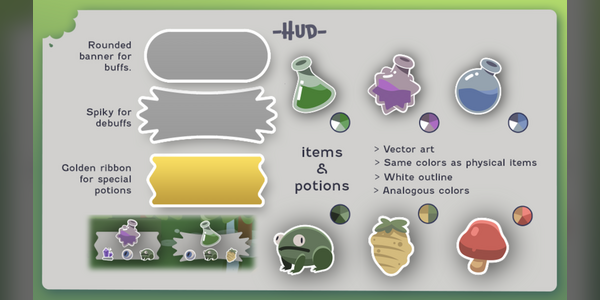 We developed a concept for our UI and Heads up Display. The idea is for there to be simple, non distracting UI elements to compliment the gameplay. For example: We will have different potion recipes pop up at the top of the screen over time while the game goes on. These recipes will show the potion type and ingredient lists. On top of that the banner shape that these icons are displayed will also tell the player certain information about the potions. A good potion will have a simple rounded banner. A potion that is used offensively will have a 'spiky' shape.