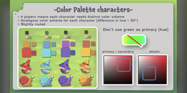 Aside from UI, we also worked on colours for the characters and environments. In this first image you can see some colour concepts for the actual player characters. These colours should stay simple, so it is easy to discern each player, and contrasting from the background.