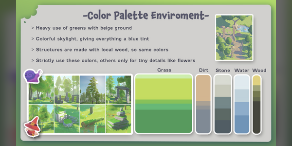 The same thing goes for the environmental assets. They should be pretty and colourful, yet not distracting from the gameplay. Therefor we set up some swatches and colour palettes that are not to harsh on the eyes, and still create enough contrast for all of the important gameplay elements to be shown on top of.