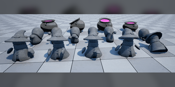 The witch has several different animations for standing still, running around, falling down, holding items and throwing items.