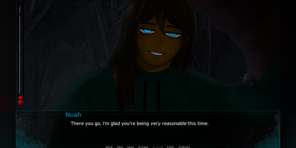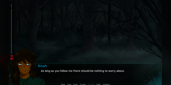 Since I've come a long way with shading I went back and fixed up the initial encounter you can get with Noah and changed out the background. It took longer than expected because some of his expressions didn't line up correctly but I'm happy with the overall foreboding theme I was aiming for. I even added a small parallax effect when he helps you up afterwards. :]