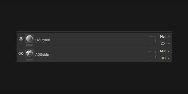 And that’s pretty much the process. From here, deactivate the AOGuide and UVLayout layers and export. You’ll only need the Base Color. If you did a high poly to low poly bake, include the normal map as well. When applying the texture maps in other software, maximize roughness and minimize metallic values. I’ve included my full layer stack for reference.